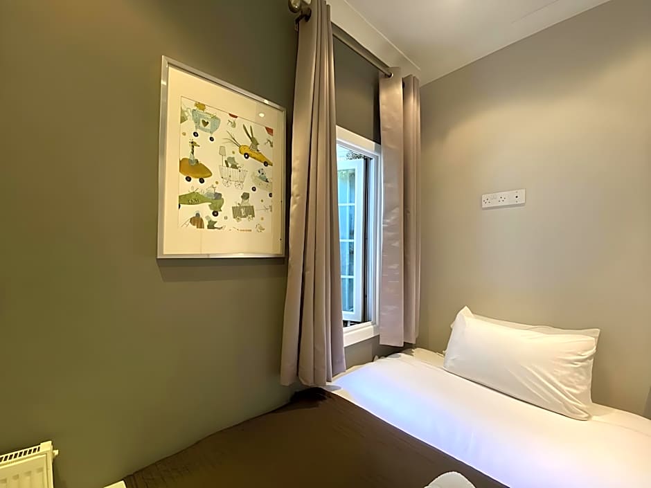 This compact room features a 2 beds with a memory foam mattress and pillows. The private modern en suite is equipped with a Hansgrohe shower and toiletries. Facilities include tea/coffee, Freeview channels, bath towels and a hairdryer. There is also free WiFi and a USB charger.